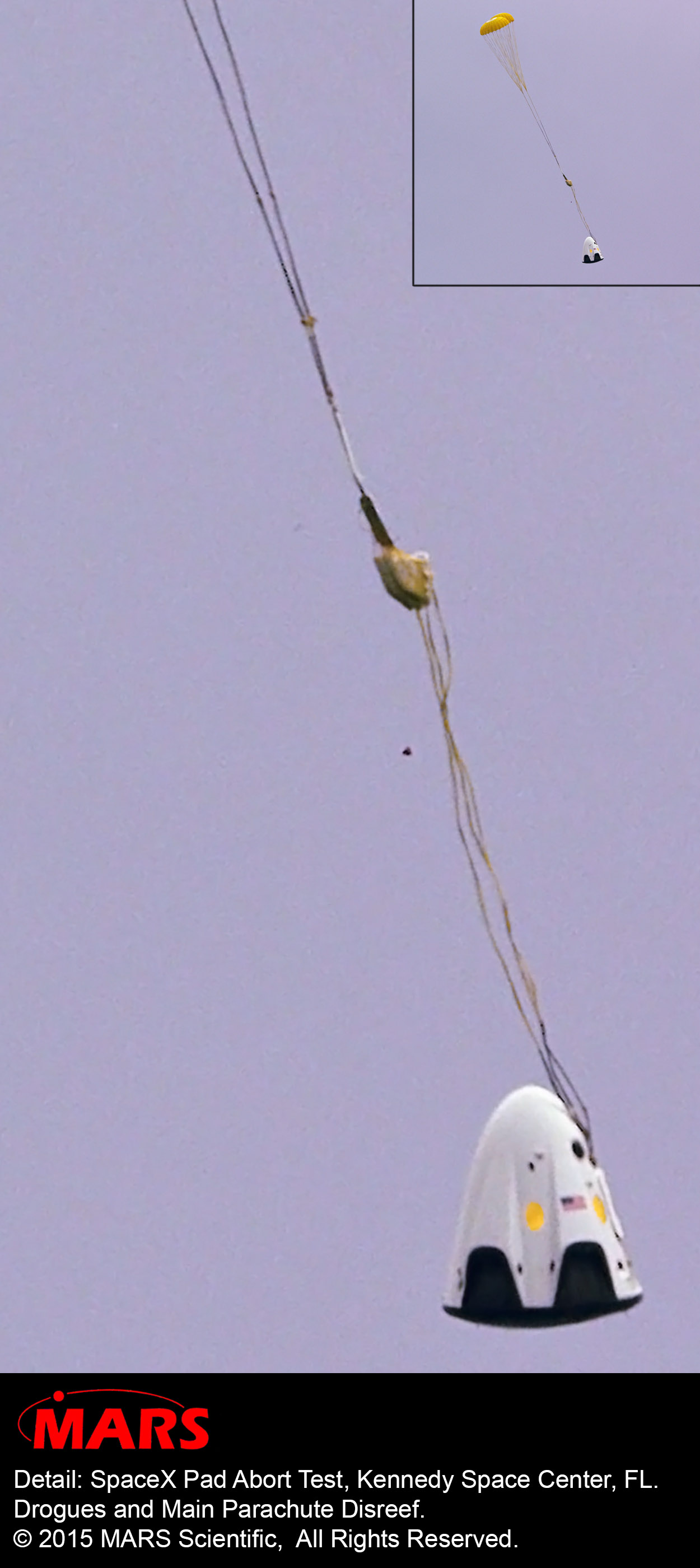 Space-X Dragon Pad Abort Test: Drogue Inflation Sequence. MARS Specializes in high speed documentation of vehicle events including parachute disreefing, sequencing Pyros, and staging events. Note ejection of hexagonal hatch cover, higher resolution images available upon request.